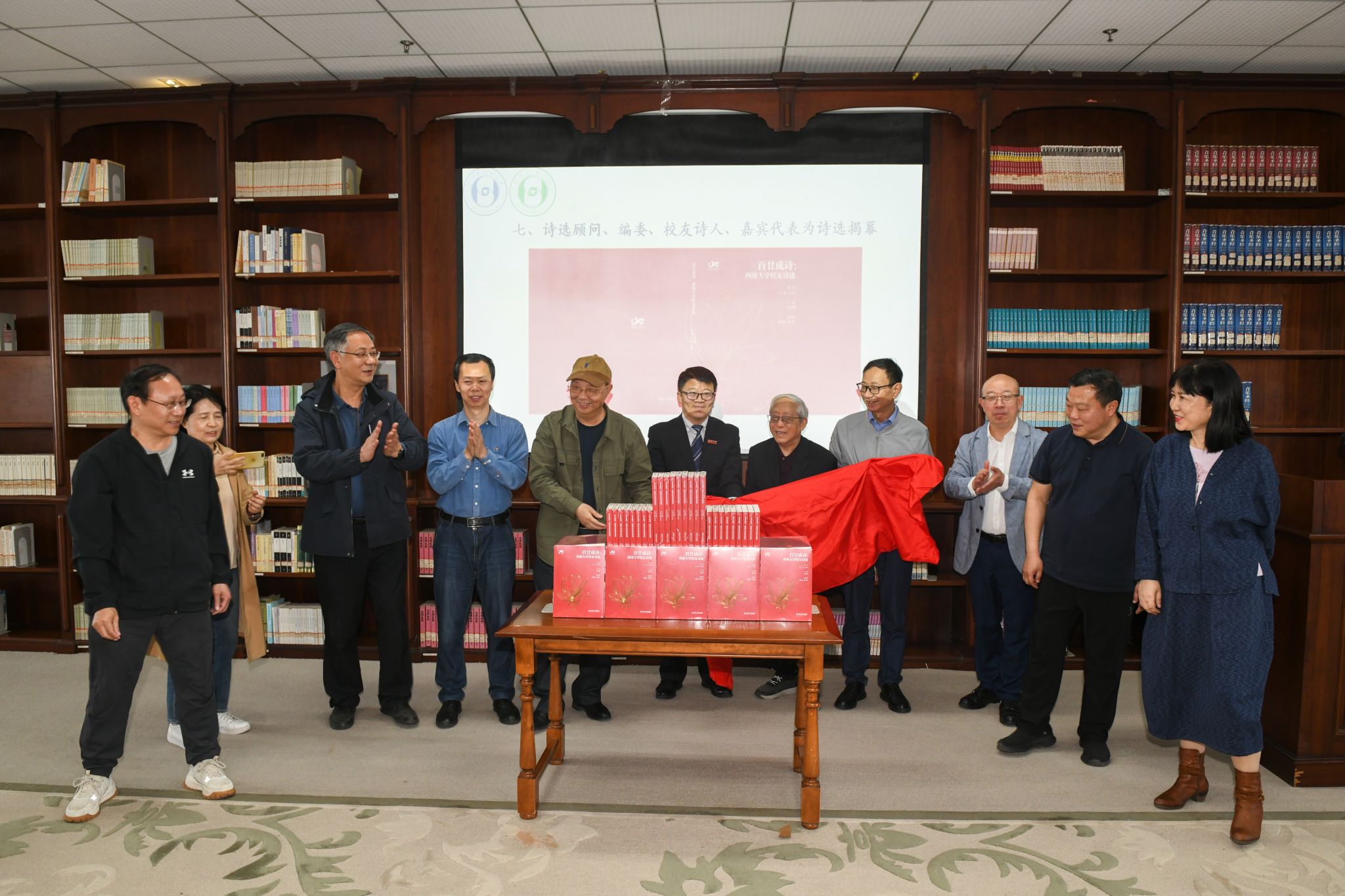 在全场热烈的掌声中,诗选顾问、编委、校友诗人与嘉宾代表共同登台,为《百廿成诗》郑重揭幕。这一刻,一部承载百廿文脉、凝结校友诗心的诗集正式面世,定格为西南大学人文传承中温暖而珍贵的瞬间。