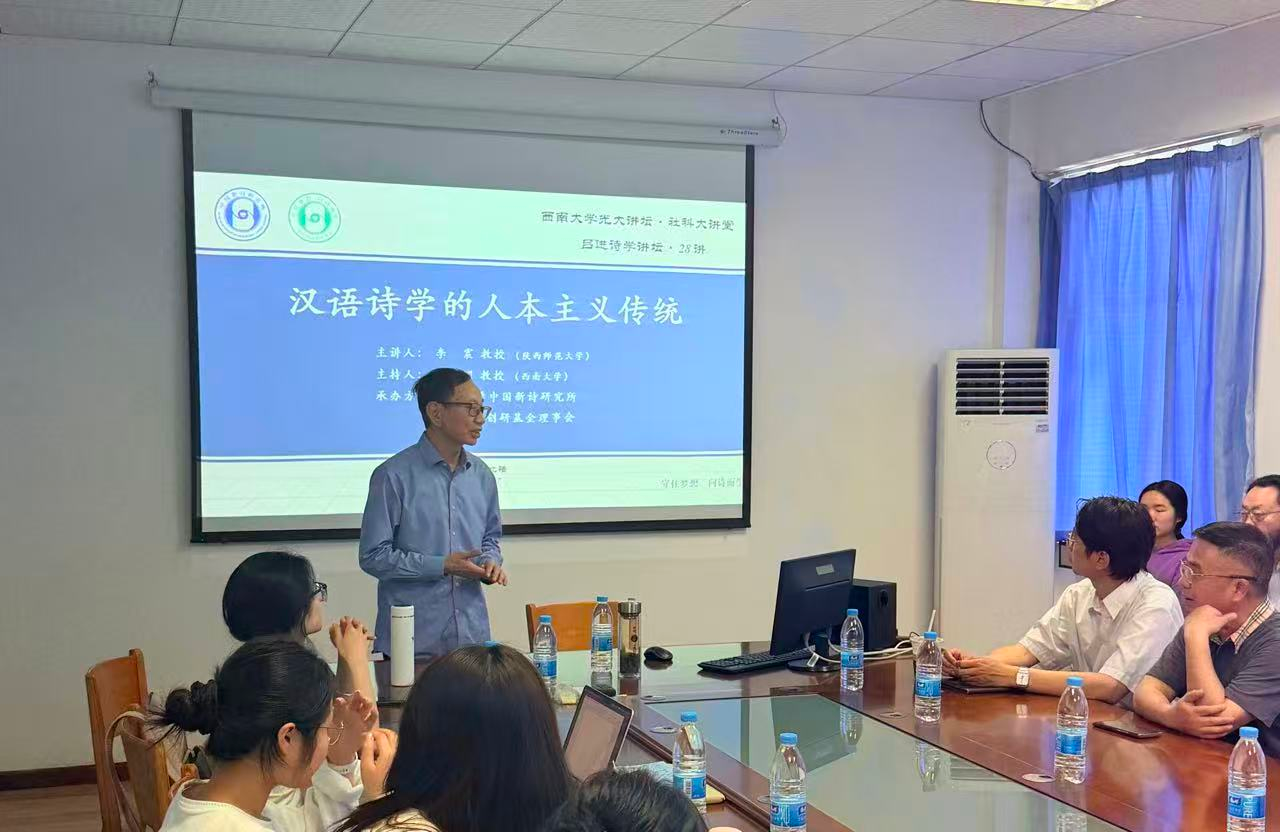 2026年4月17日15:00,西南大学光大讲坛暨社科大讲堂、吕进诗学讲坛第二十八讲在西南大学中国新诗研究所会议室(荟文楼807)顺利举行。本次讲座以“汉语诗学的人本主义传统”为主题,由陕西师范大学文学院教授、中国文艺评论家协会理论委员会主任李震主讲,西南大学中国诗学研究中心向天渊教授主持。重庆作协诗创委副主任吴向阳先生、浙江越秀外国语学院英语学院副教授钱志富先生、《重庆文艺》副总编辑王彦女士、渝州诗会会长黄干先生受邀参与,新诗所梁笑梅、张立新、程晋、杨晓瑞、许金琼等老师及硕博研究生30余人也出席了讲座。讲座围绕汉语诗学的文化哲学根基、诗学观、批评形态与方法及其对自主知识体系构建的意义展开探讨。